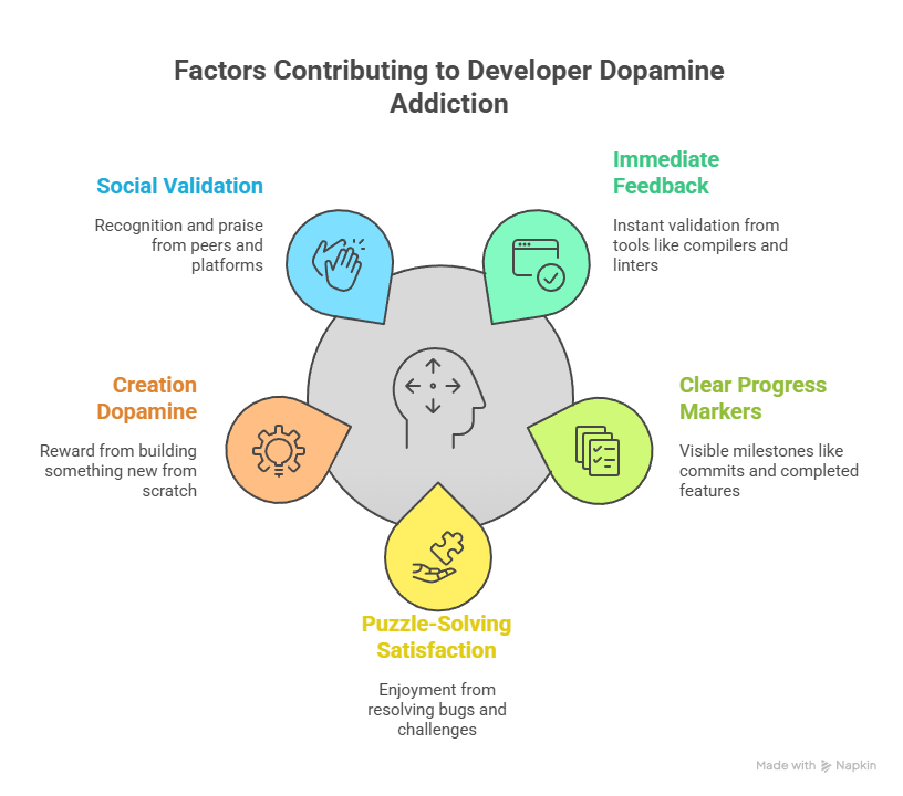 The Struggle: As you work through the problem, dopamine levels fluctuate. Each small breakthrough (a successful compile, a test passing, understanding a complex function) provides micro-rewards that keep you engaged.