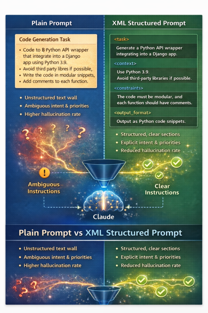 Plain prompts rely on unstructured text, forcing Claude to infer intent, priority, and constraints, which often leads to instruction loss and hallucinations. XML-structured prompts remove this ambiguity by explicitly separating tasks, context, constraints, and output format, enabling Claude to process instructions with greater accuracy and consistency.