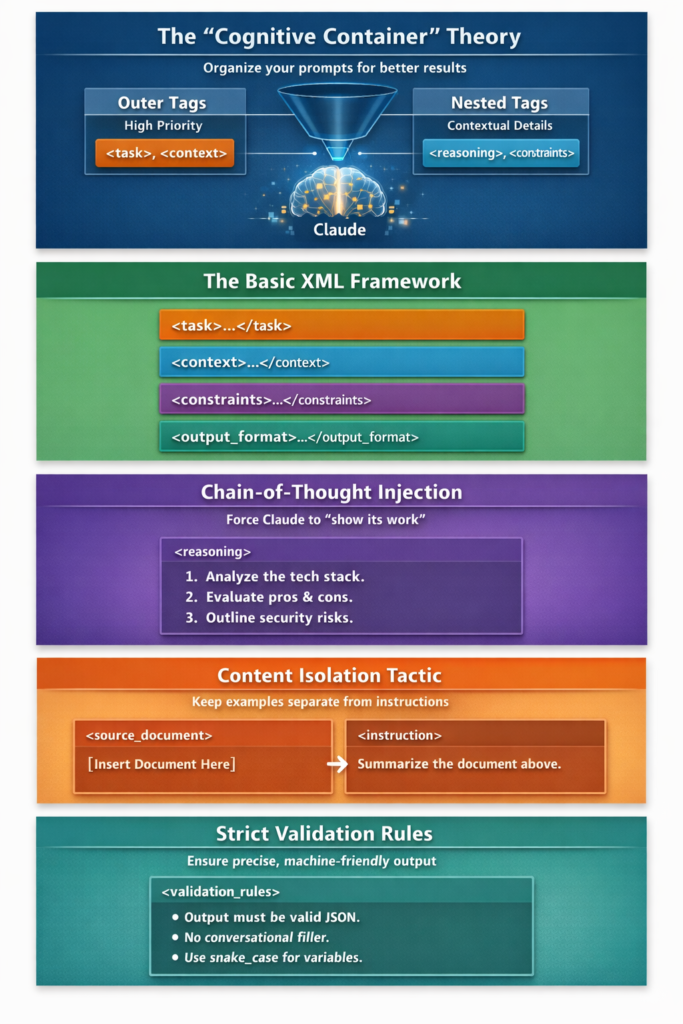 In practice, XML tags function as cognitive containers that tell the model: