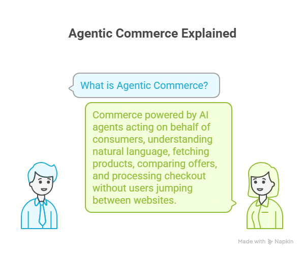 Agentic commerce refers to commerce flows powered by AI agents acting on behalf of consumers. These agents can understand natural language, fetch products, compare offers, and even process checkout without requiring users to jump between websites.