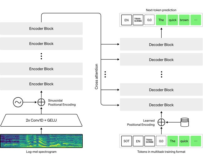 - Audio → Log-Mel Spectrogram → Encoder → Decoder → Text